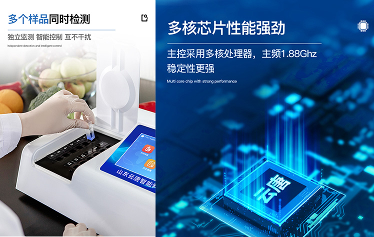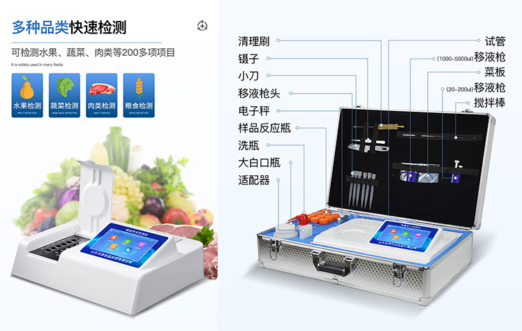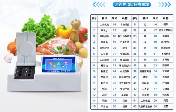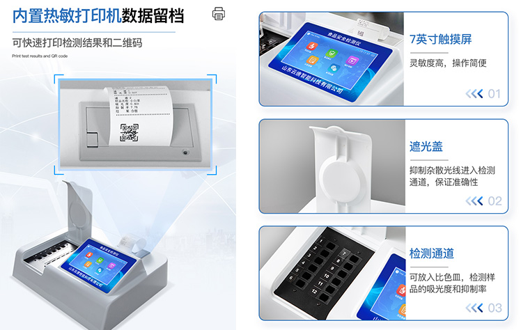 | 安卓智能操作系統(tǒng),采用更加**和人性化操作,儀器具有網(wǎng)線連接、wifi聯(lián)網(wǎng)上傳、GPRS無線遠傳功能,快速上傳數(shù)據(jù)。 | 智能化程度高,儀器具有自檢功能:具有開機自檢和調零功能,具有自動檢測重復性功能。 | 檢測通道:≥12個檢測通道,可以同時測試多個樣品,每個樣品由程序控制分別獨立工作,不會互相干擾。 | 顯示方式:≥8英寸液晶觸摸屏顯示,人性化中文操作界面,讀數(shù)直觀、簡單。 | 配備新一代嵌入式熱敏打印機,可選擇手動打印或者自動打印,檢測完成可自動打印檢測報告和二維碼。 | 光源采用進口超高亮發(fā)光二極管,高精度、穩(wěn)定性強、光源可控、可以關掉不使用的光源,功耗更低。 | 采用USB2.0接口設計,方便數(shù)據(jù)的存貯和移動,并可隨時與計算機直接相連,并且可用計算機控制儀器。實現(xiàn)數(shù)據(jù)查詢、瀏覽、分析、統(tǒng)計、打印等。 | 儀器帶有監(jiān)管平臺。數(shù)據(jù)可局域網(wǎng)和互聯(lián)網(wǎng)數(shù)據(jù)上傳,檢測結果直接傳至食品安全監(jiān)管平臺。進行區(qū)域食品安全監(jiān)管及大數(shù)據(jù)分析處理,檢測區(qū)域食品安全長短期動態(tài),達到食品安全問題預估、預警 | 一體化便攜式快檢設備,滿足現(xiàn)場及流動檢測使用需求,能夠在同一軟件下實現(xiàn)所有檢測項目的檢測,并可通過同一窗口直觀顯示檢測結果。 | 儀器具有多品類多種類樣品菜單庫,可靈活選擇檢測樣品,不同的檢測通道可同時檢測不同的樣品項目。也可在儀器上直接編輯錄入樣品名稱、檢測指標、送檢單位等信息并保存進樣品數(shù)據(jù)庫。 | 樣品處理簡單省力,整體操作快速、安全、便捷。 | 儀器具有自身保護功能,可設置用戶名及密碼,防止非工作人員操作等。 | 高靈敏度,高檢測精度,高重復性精度,掃描式高精度光學傳感器。 | 儀器具有重新校準、鎖定、恢復出廠設置功能。 | 支持U盤存儲。 結果判定線可修改,對照值標定值可保存,斷電不丟失數(shù)據(jù)。 |