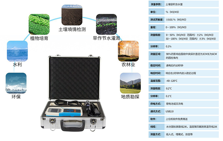 土壤水分測定儀采用FDR頻域反射原理,快速準(zhǔn)確測量土壤中含水量,可對多處樣地、不同土壤深度的水分含量進行快速檢測和長期連續(xù)監(jiān)測。廣泛應(yīng)用于土壤墑情檢測、旱作節(jié)水灌溉、精細農(nóng)業(yè)、林業(yè)、地質(zhì)勘探、植物培育等領(lǐng)域。