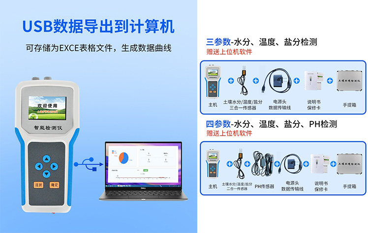 | 儀器可加配4G聯(lián)網(wǎng)功能和數(shù)據(jù)管理平臺,將本機存儲的歷史數(shù)據(jù)無線上傳到智慧云農(nóng)業(yè)平臺,方便用戶進行數(shù)據(jù)管理和長期分析。 | 可選擇記錄模式:手動記錄、自動記錄,自動記錄可設(shè)置記錄時間間隔。 | 采用一體化結(jié)構(gòu)設(shè)計,集液晶顯示儀表+傳感器+便攜手提箱合成在一個便攜式手提箱內(nèi),本機體積小巧,操作簡單,性能可靠,野外攜帶極為方便。 | 大屏幕中文液晶顯示,可實時顯示溫度值、水分值、組數(shù)、低電壓示警,存儲數(shù)據(jù)等,便于野外攜帶作業(yè)。 | 儀表可設(shè)置多種土質(zhì)配方,便于不同土質(zhì)的水分測量。 | 能存儲指定各個點的土壤溫度值、水分值,上位機軟件功能強大,隨時可以通過USB接口將記錄中的數(shù)據(jù)導(dǎo)出到計算機上,并可以存儲為EXCE表格文件,生成數(shù)據(jù)曲線,以供其它分析軟件進一步進行數(shù)據(jù)處理。 |