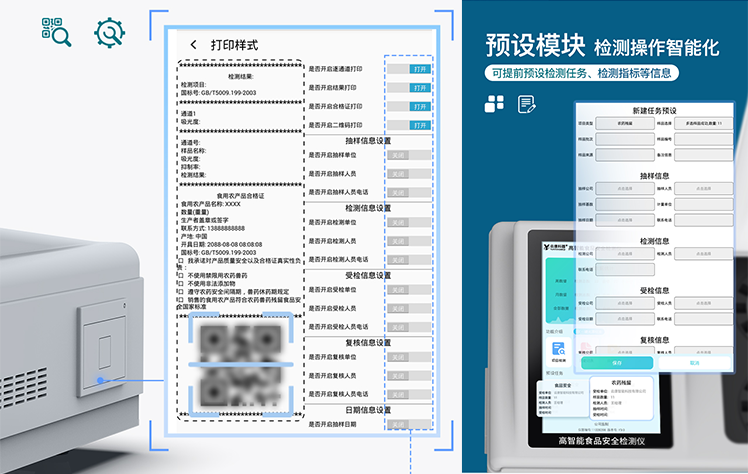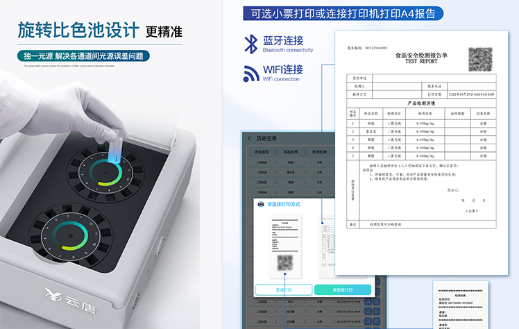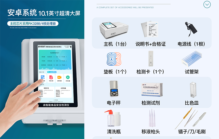 | 1)儀器采用臺式一體化系統檢測技術,新型農殘檢測模塊、數字化管理模塊、無線通訊模塊高度集成于一體,同時預留升級檢測方法。 | 2)儀器檢測模塊標準化、智能化,可隨意自由組合。檢測箱體內置多個標準檢測單元,檢測模塊可以調整配置。 | 3)儀器采用全新安卓智能系統,主控芯片采用 ARM Cortex-A7,RK3288/4核處理器,10.1寸高清液晶觸摸豎屏,更加**的UI交互界面,運轉快捷;儀器配備無線通信模塊: 4G(APN)通訊模塊、Wifi模塊,藍牙傳輸,同時具有雙USB接口以及RJ45接口能以多種方式實現數據保存和數據傳輸功能。 | 4)創新檢測模式:檢測通道:≥24通道;采用精密旋轉比色池設計,使用同芯片同光源校準精度,解決不同光源之間的誤差值。1-12通道間誤差0.1%。(***:ZL202022821055.2) 儀器具有自動識別比色皿檢測功能,即:將樣品比色皿放入儀器后,點擊樣品檢測,儀器自動識別比色皿進行通道檢測。 | 5)進口高精光源:高精度進口四波長冷光源,通道配置 410、520、590、630nm 波長光源,一個光源芯片驅動一個光源,誤差極小,每臺設備單獨**校準光源,**比對,同時參照四種不同波段光源全方位覆蓋市面上99%的農殘食品項目檢測,可按照實際需求進行食品項目檢測升級。 | 6)智能操作分析系統: | 6.1.便捷操作系統:設備檢測時可在同一檢測界面自動對應相關檢測通道一次性選擇1-24個樣品名稱,無須退出界面,節省操作時間。 | 6.2.數據集成系統:設備首頁自動統計檢測數據包含:周檢測數據、月檢測數據,全部檢測總數量,均包含檢測總數,合格數,不合格數,以及相關柱形分析圖,對各項檢測數據清晰掌握,無需電腦查詢,更加快捷直觀。 | 6.3.項目預設系統:支持添加單個及多個相同或不相同的任務預設,一鍵快速調取,每一個任務分別可以設置不同的樣品、批次、編號、來源、備注、抽樣信息、檢測信息、受檢信息、復核信息等更多信息。 | 6.4.數據監管系統:同步對接監管平臺,數據可局域網和互聯網數據上傳,檢測結果可選擇直接傳至食品安全監管平臺。集成OSS輸出存儲服務、區分設備定向管理應用,進行區域食品安全監管及大數據分析處理與數據統計,檢測區域食品安全長短期動態,達到食品安全問題預估、預警。 | 6.5.自定義打印系統:內置新創自定義打印系統,可按需靈活設置開啟或關閉:產品合格證(國家農業部標準),二維碼,抽樣信息、檢測信息,受檢信息、復核信息、抽樣日期、檢測日期等信息的打印。 | 6.6.A4版本報告打印功能:設備可自動生成A4版報告,外接打印機即可打印 | 6.7.系統遠程更新功能:可定向分客戶分儀器更新系統,按照不同客戶后期實際需求添加項目,無需設備返廠,即可遠程實時升級全新系統,節省時間成本及避免運輸造成設備損壞。 | 7)安全證書,放心保障:儀器具有中國計量科學研究院校準證書,權威認證。 |