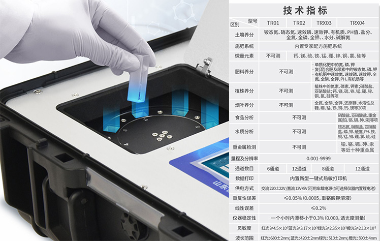可對土壤、肥料、作物、蔬菜、水果、水質、食品等樣品中的砷、鉛、鎘、鉻、汞、鐵、鋁、鋅、錳、銅等進行快速聯合測定。