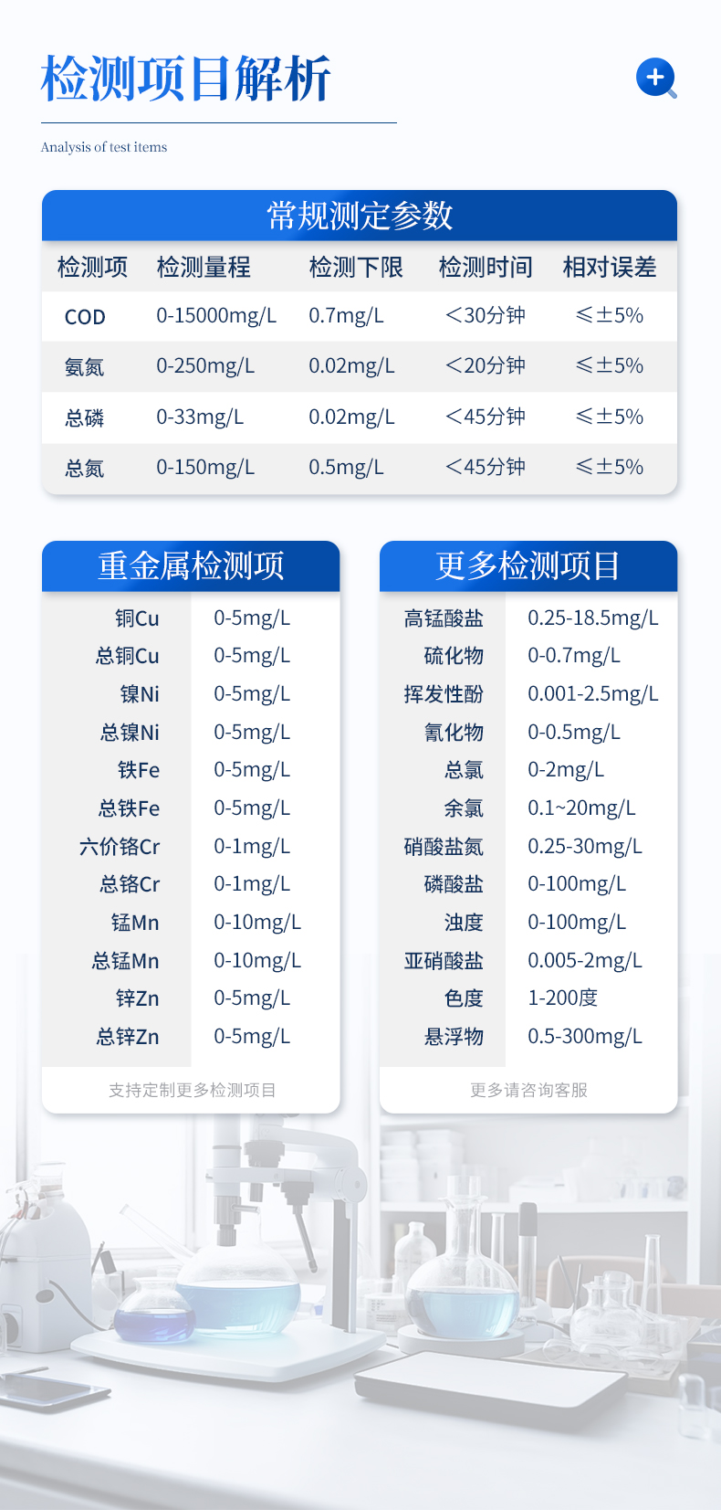 COD測定儀能夠廣泛的應用于各種行業(工業廢水、城市污水、生活污水及江湖流域地表水)廢水的檢測,可適合不同用戶的多種需求,可在化工、石油、焦化、造紙、冶金、釀造、醫藥等工業廢水及各種生活污水監測應用。