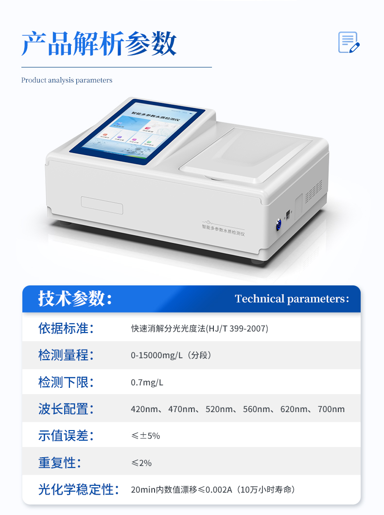 | 波長配置:420nm、470nm、520nm、560nm、620nm、700nm; | 示值誤差:≤±5%; | 儀器穩定性:<0.5%; | 儀器重復性:<0.5% | 光化學穩定性:20min內數值漂移≤0.002A(10萬小時壽命); | 依據標準:HJ/T399-2007水質化學需氧量快速檢測法; | 檢測量程:0-15000mg/L(分段); | 檢測下限:0.7mg/L; |
