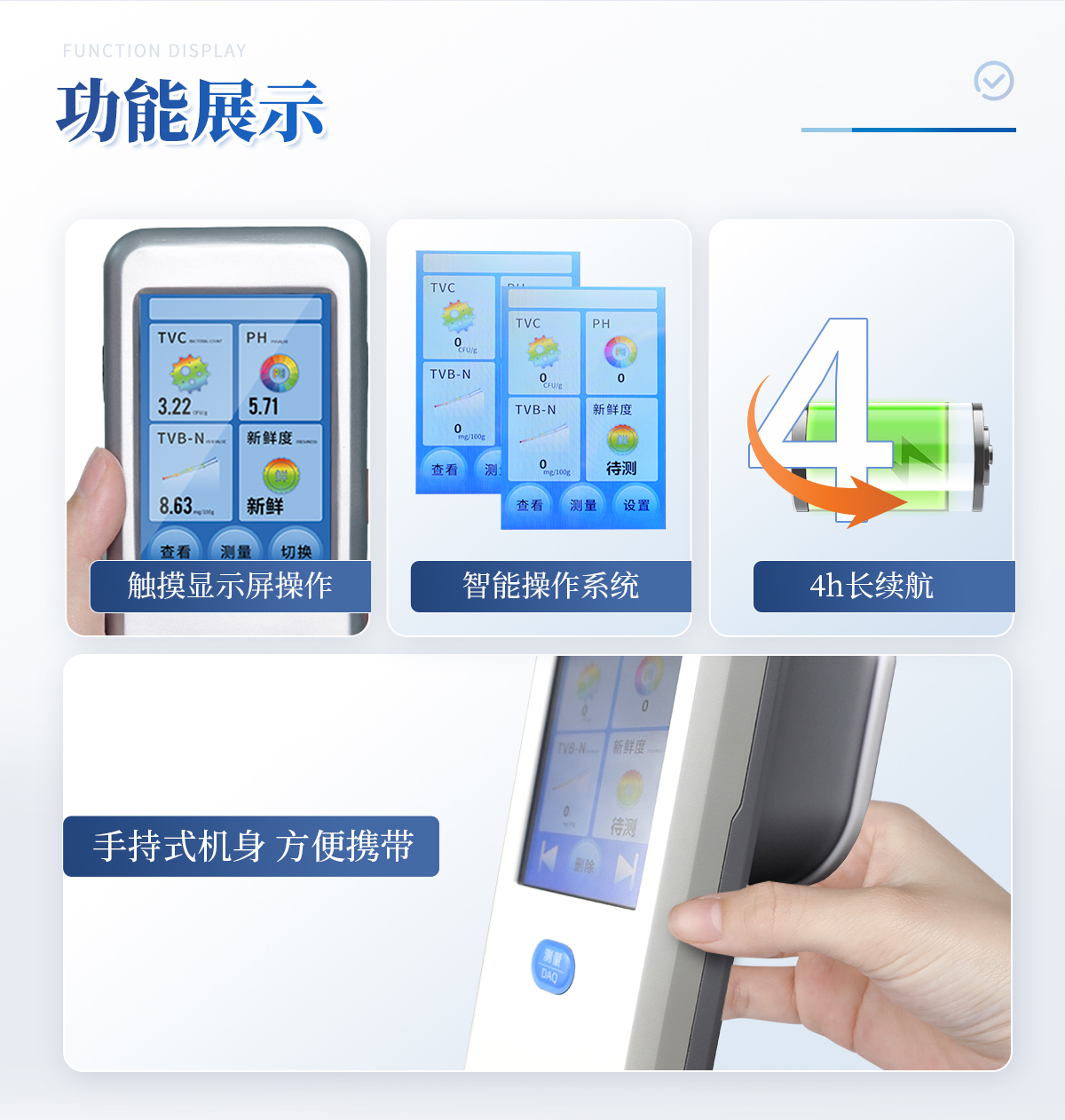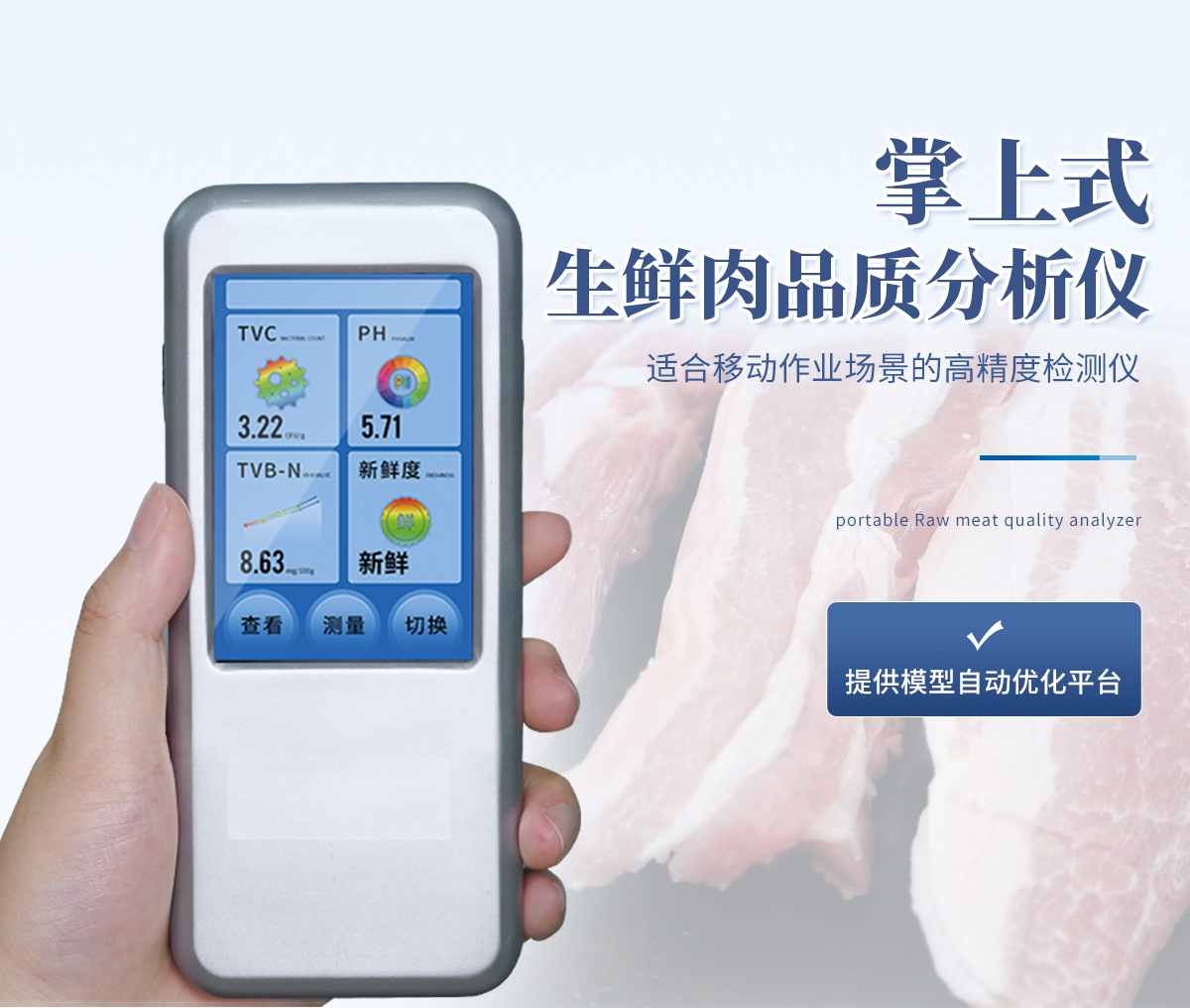 聯合中國農業大學彭彥昆教授團隊研發的掌上式生鮮肉新鮮度分析儀,可用于檢測生鮮肉的TVC、pH、TVB-N、新鮮度、L*、A*、B*等評價指標。Palmarter具有體積小、便 于攜帶、性價比高等特點,其應用場景包括但不限于肉儲運企業、肉品品質監管部門、飯店、超市、菜場、家庭等。