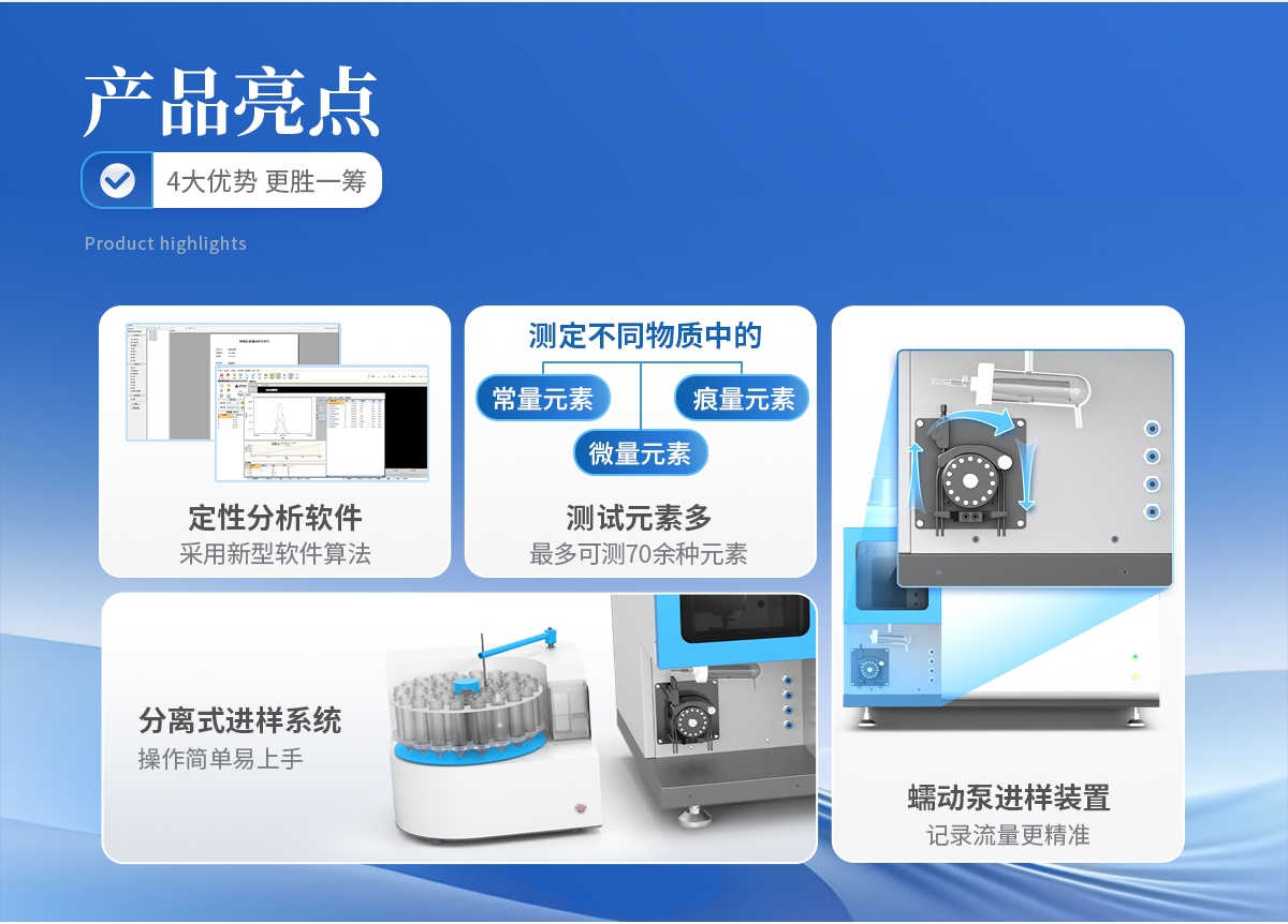 1、測試元素多,*多可測 70 余種元素。 2、多元素同時測試,一次進樣所有元素同時測試。 3、分析速度快,每分鐘約 5 個元素,*快測試速度可到每分鐘 10 個元素。 4、檢出限低,絕大多數元素可達 ppb 級。 5、線性范圍寬,可達 5-6 個數量級,可以實現高低含量同時測試,無需更換標 準曲線。 6、化學干擾少,測試結果更加精準。