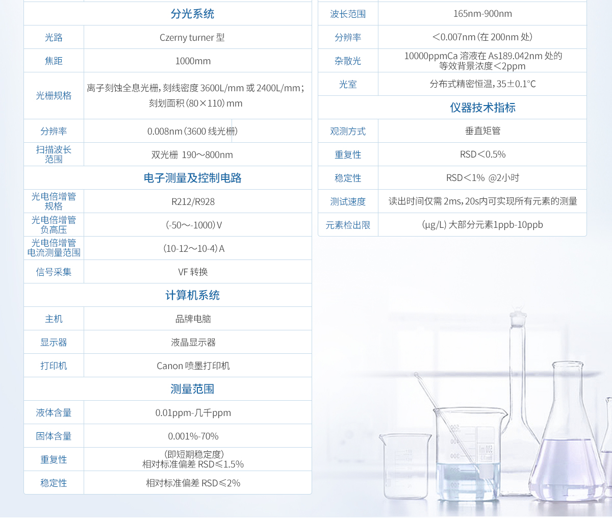 6、測量范圍 a.液體含量:0.01ppm-幾千 ppm b.固體含量:0.001%------70% 重復性:(即短期穩定度)相對標準偏差 RSD≤1.5% 穩定性:相對標準偏差 RSD≤2% 測試速度:5-10元素/每分鐘