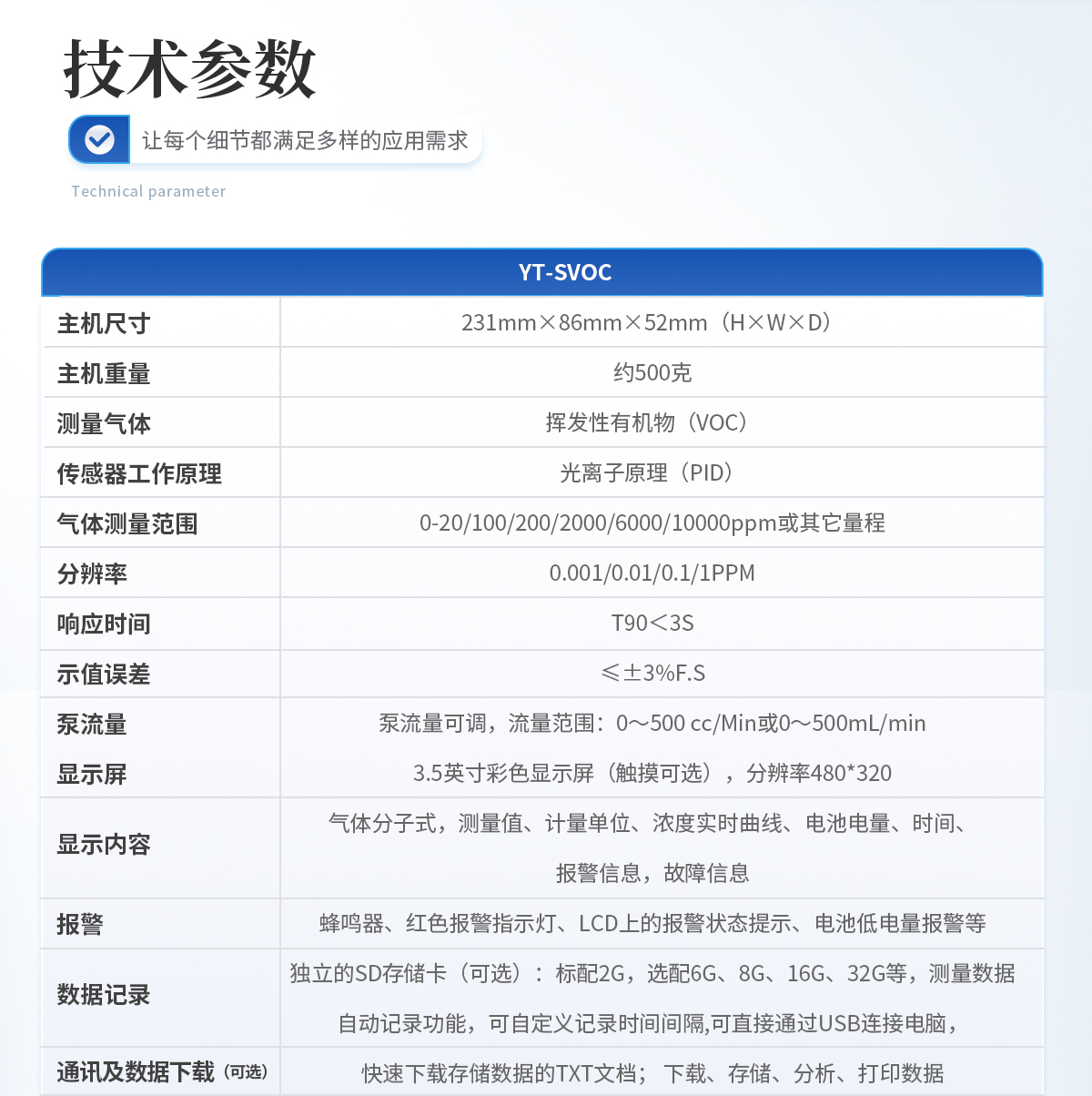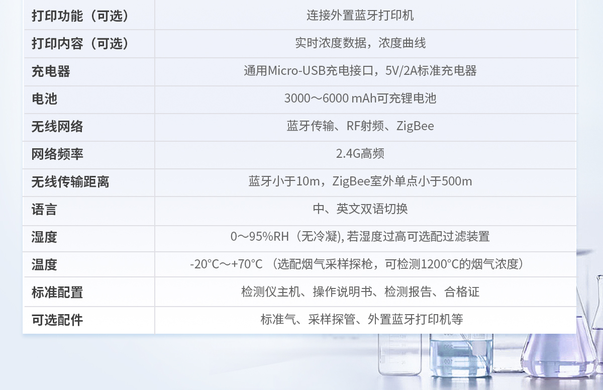 主機尺寸:(H x W x D)231*86*52mm 主機重量:約500克 測量氣體:揮發性有機物(VOC) 傳感器工作原理:光離子原理(PID); 氣體測量范圍 :0-20/100/200/2000/6000/10000ppm或其它量程 分辨率:0.001/0.01/0.1/1PPM 響應時間 :T90<3S 示值誤差: ≤±3%F.S 泵流量:泵流量可調,流量范圍:0~500 cc/Min或0~500mL/min 顯示屏:3.5寸彩色顯示屏(觸摸可選),分辨率480*320 顯示內容:氣體分子式,測量值、計量單位、濃度實時曲線、電池電量、時間、報警信息,故障信息 報 警:蜂鳴器、紅色報警指示燈、LCD上的報警狀態提示、電池低電量報警等 數據記錄:獨立的SD存儲卡(可選):標配2G,選配6G、8G、16G、32G等 測量數據自動記錄功能,可自定義記錄時間間隔 通訊及數據下載 (可選):可直接通過USB連接電腦,快速下載存儲數據的TXT文檔; 下載、存儲、分析、打印數據 打印功能(可選):連接外置藍牙打印機 打印內容(可選):實時濃度數據, 濃度曲線 充電器:通用Micro-USB充電接口,5V/2A標準充電器 電池:3000~6000 mAh可充鋰電池 無線網絡:藍牙傳輸、RF射頻、ZigBee 網絡頻率 :2.4G高頻 無線傳輸距離 :藍牙小于10m,ZigBee室外單點小于500m 語 言:中、英文雙語切換 濕 度:0~95%RH(無冷凝), 若濕度過高可選配過濾裝置 溫 度:-20℃~ +70℃ (選配煙氣采樣探槍,可檢測1200℃的煙氣濃度)