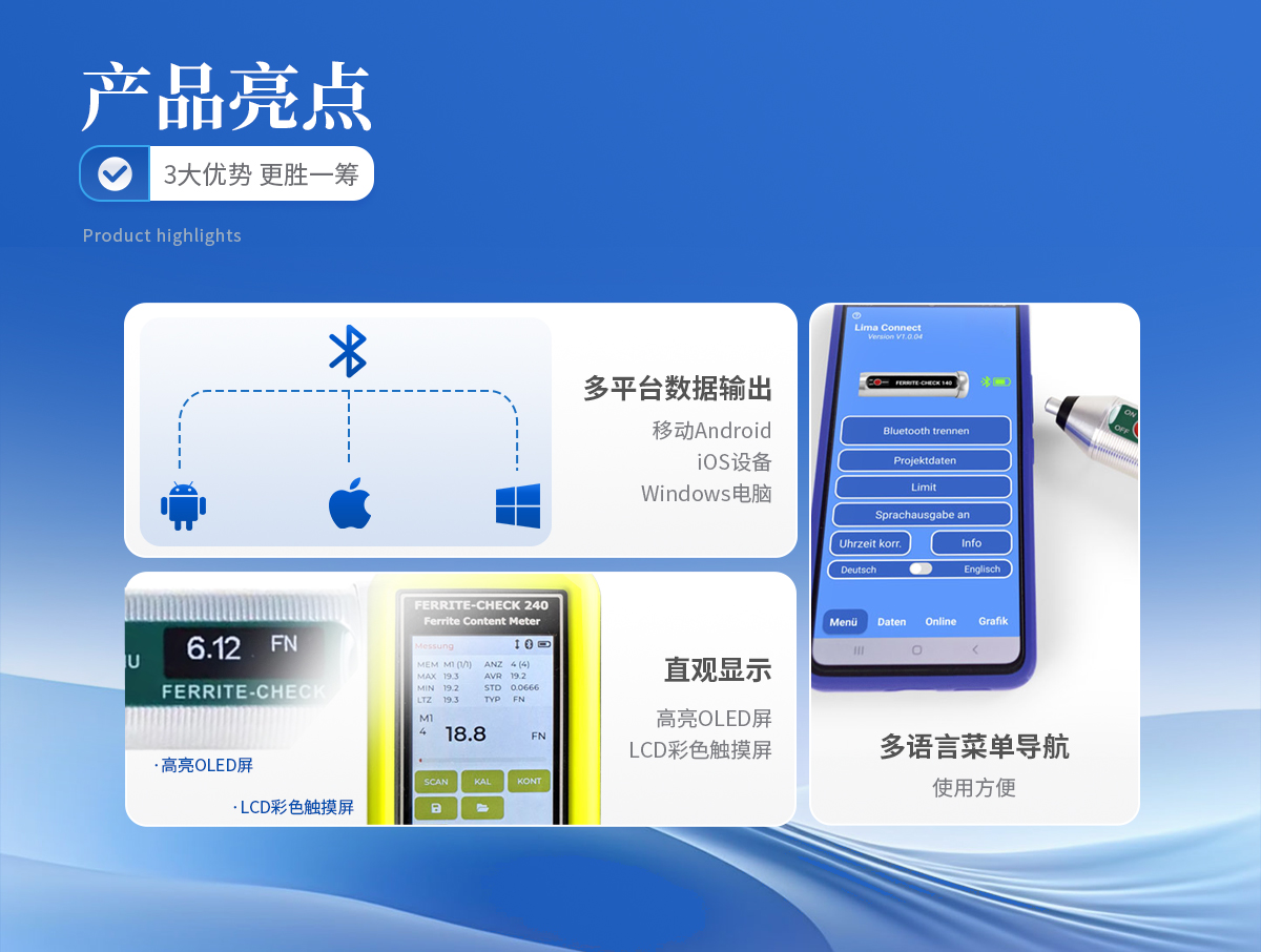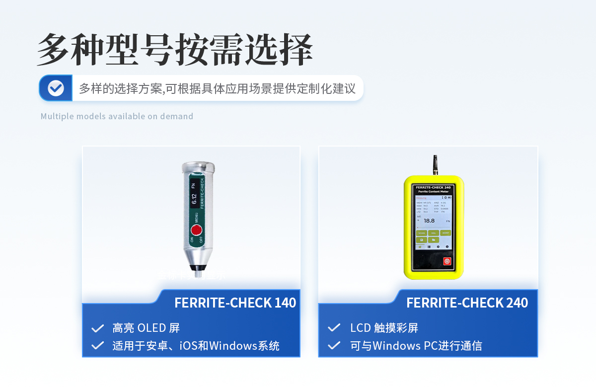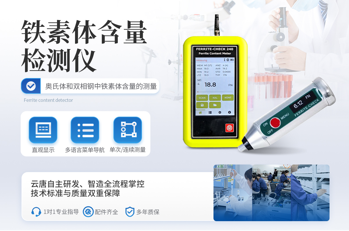 鐵素體含量檢測儀操作簡單 List-Magnetik公司 FERRITE-CHECK 140鐵素體含量檢測儀是一款設計緊湊、使用方便的便攜儀器,儀器配有集成探頭,儀器符合Basel標準DIN EN ISO 8249,使用磁感應法測量奧氏體鋼和雙相鋼中的鐵素體含量。 高亮OLED顯示鐵素體含量 FERRITE-CHECK 140鐵素體含量檢測儀只有一個按鈕,并配有多語言菜單導航,非常易于使用。高亮度OLED屏顯示FN或Fe%的測量結果。 測量焊縫中的鐵素體含量 特別是對于焊接的雙相鋼,重要的是要知道焊縫是否有足夠的鐵素體含量來保證焊縫的強度。鐵素體含量低的話,焊縫受熱后較容易產生裂紋,但如果鐵素體含量過高,焊縫的韌性和延展性將會喪失。 快速連續鐵素體含量測量 使用FERRITE-CHECK 140鐵素體含量檢測儀,可以非常準確和快速地測定鐵素體含量。檢測光滑或拋光表面上的焊縫時,可以將儀器切換到快速連續測量模式。當探頭放置在表面上并沿表面移動時,測量值將連續存儲,在提起探頭后,屏幕將顯示的*小值、**值和平均值組成的統計信息。 校準鐵素體含量檢測儀 FERRITE-CHECK 140鐵素體含量檢測儀配有3個校準標準片,可追溯到NIST 管理和發送測量數據與免費的應用程序 為了進一步處理測量數據,您可以將FERRITE-CHECK 140鐵素體含量檢測儀與移動Android和iOS設備配對。或者與一臺Windows電腦通信。這是由低功耗藍牙技術(BLE)實現的。使用Lima Connect應用程序,您可以管理項目并在照片上分配測量點。測量結果可以統計評估和圖形顯示。這款應用適用于安卓、iOS和Windows系統,軟件免費的。