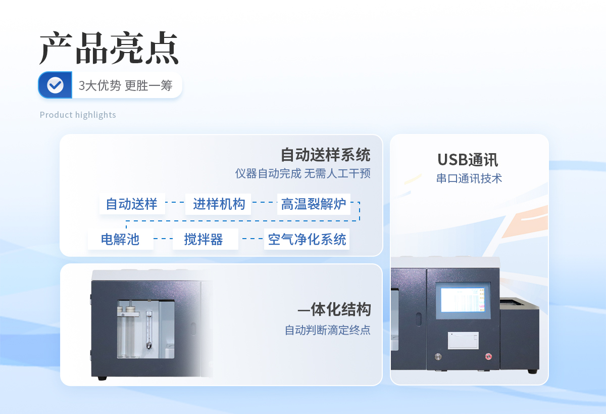 | 1、 手自一體化自動送樣系統(tǒng),將自動送樣、進樣機構、高溫裂解爐、電解池、攪拌器、空氣凈化系統(tǒng)等部件巧妙地結(jié)合在一起,使儀器結(jié)構更加緊湊,更加合理、更加穩(wěn)定。可在線式插隊添加樣品,無需人工送樣,自動化程度高,若樣品少也可采用手動送樣方式。 | 2、采用—體化結(jié)構,自動判斷滴定終點,縮短了實驗時間。所有關鍵部件均采用了設計理念及進行了嚴格的控制,確保儀器能長時間穩(wěn)定運行。 | 3、采用特別的數(shù)據(jù)采集網(wǎng)絡及多級校正技術,確保高、中、低硫含量測試結(jié)果的準確性。 | 4、送樣機構采用電子電解液分子濃度采集電路,可靠性高,不會產(chǎn)生過電解現(xiàn)象。 | 5、串口通訊技術,可采用usb通訊,兼容性好,具有廣泛的適用性。 | 6、自由設置送樣時間及預置溫度,采用進口霍爾元件控制送樣位置。 | 7、采用剛玉瓷舟,減少卡樣的可能。一次可放1-24個樣由程序控制實現(xiàn)自動升溫、控溫、送樣、測定,結(jié)果自動存盤、自動打印,并可中途在線式插隊添加試樣,大大地提高了工作效率,真正實現(xiàn)無人值守; | 8、采用庫侖滴定法進行測定,測定時間可根據(jù)不同試樣自動判斷,速度優(yōu)于艾士卡重量分析法和高溫燃燒中和法; |