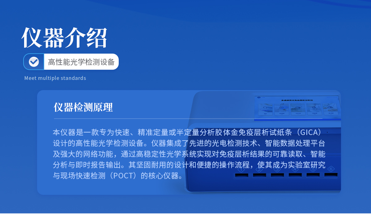 | 本儀器是一款專為快速、精準(zhǔn)定量或半定量分析膠體金免疫層析試紙條(GICA)和熒光免疫層析試紙條(FICA)設(shè)計(jì)的高性能光學(xué)檢測(cè)設(shè)備。儀器集成了**的光電檢測(cè)技術(shù)、智能數(shù)據(jù)處理平臺(tái)、高通量設(shè)計(jì)及強(qiáng)大的網(wǎng)絡(luò)功能,通過高穩(wěn)定性光學(xué)系統(tǒng)實(shí)現(xiàn)對(duì)免疫層析結(jié)果的可靠讀取、智能分析與即時(shí)報(bào)告輸出。其堅(jiān)固耐用的設(shè)計(jì)和便捷的操作流程,使其成為實(shí)驗(yàn)室研究與現(xiàn)場快速檢測(cè)(POCT)的核心儀器之一。 |