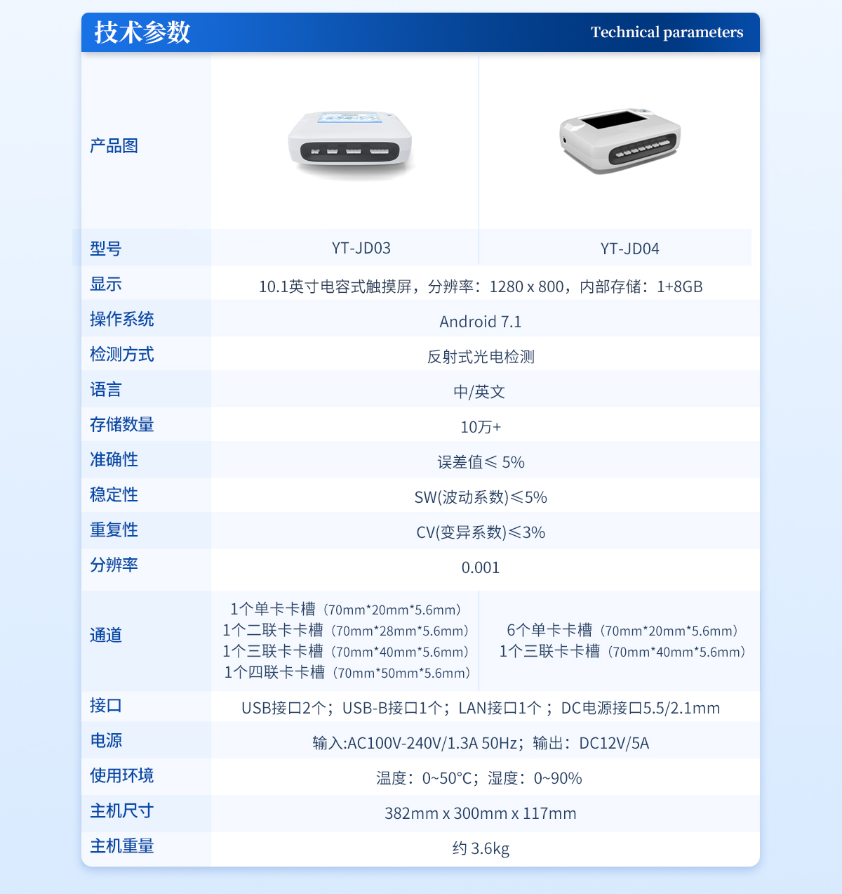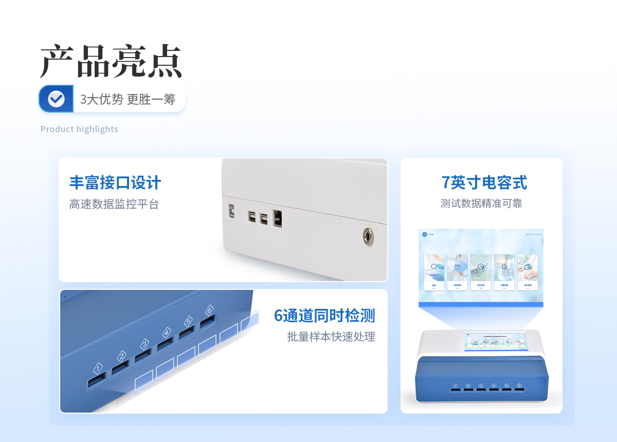 | 1、 ★通道同時(shí)支持膠體金檢測(cè)卡和熒光檢測(cè)卡的檢測(cè),無需切換模塊 | 2、 ★多通道單卡+多聯(lián)卡設(shè)計(jì)方案,顯著提升檢測(cè)效率,滿足批量樣本快速處理需求; | 3、 Android觸控系統(tǒng)結(jié)合大尺寸高清屏幕,界面友好,操作簡單流暢,無需外接設(shè)備; | 4、 可存儲(chǔ)500萬條檢測(cè)結(jié)果,支持按日期靈活查詢、預(yù)覽、刪除結(jié)果,并生成多樣化專業(yè)報(bào)告。 | 5、 內(nèi)置熱敏打印機(jī),檢測(cè)完成即可現(xiàn)場打印標(biāo)準(zhǔn)報(bào)告,提升工作效率。 | 6、 關(guān)鍵部件實(shí)時(shí)自診斷功能,保障儀器長期穩(wěn)定運(yùn)行。 | 7、 高速有線/無線網(wǎng)絡(luò)及藍(lán)牙,構(gòu)建完善的數(shù)據(jù)監(jiān)控平臺(tái),實(shí)現(xiàn)數(shù)據(jù)實(shí)時(shí)上傳、遠(yuǎn)程查詢、統(tǒng)計(jì)分析和監(jiān)管協(xié)同。 | 8、 豐富的接口設(shè)計(jì),輕松連接電腦、U盤、網(wǎng)絡(luò)及上位機(jī)系統(tǒng),支持U盤導(dǎo)出。 | 9、 孵育模塊為特定試紙條反應(yīng)提供**溫度環(huán)境。 | 10、 流線型結(jié)構(gòu),緊湊輕便,兼顧實(shí)驗(yàn)室耐用性與檢測(cè)需求。 | 11、 二維碼掃描錄入樣本信息,避免人工錯(cuò)誤 | 12、 插卡判斷:檢測(cè)卡未插入檢測(cè)通道不能內(nèi)置質(zhì)控功能,可設(shè)備送檢、設(shè)備自檢、試劑卡自檢測(cè)方式:孵育檢測(cè)、即時(shí)檢測(cè)(對(duì)檢測(cè)數(shù)據(jù)復(fù)檢核實(shí)) | 13、 檢測(cè)曲線:可以對(duì)試劑卡的檢測(cè)核驗(yàn),防止誤判 | 14、 檢測(cè)結(jié)果:報(bào)告出檢測(cè)項(xiàng)目、被測(cè)物質(zhì)的濃度、檢測(cè)單位、被檢查單位、檢驗(yàn)員、檢測(cè)時(shí)間、檢測(cè)限等信息可在觸摸屏上顯示,可通過儀器內(nèi)置打印機(jī)輸出 | 15、 項(xiàng)目管理:支持檢測(cè)項(xiàng)目拓展功能 | 16、 界面設(shè)置:可修改標(biāo)題和頁尾信息,靈活展示儀器信息 |
