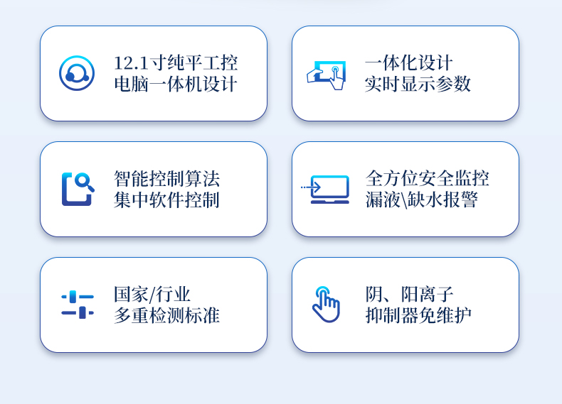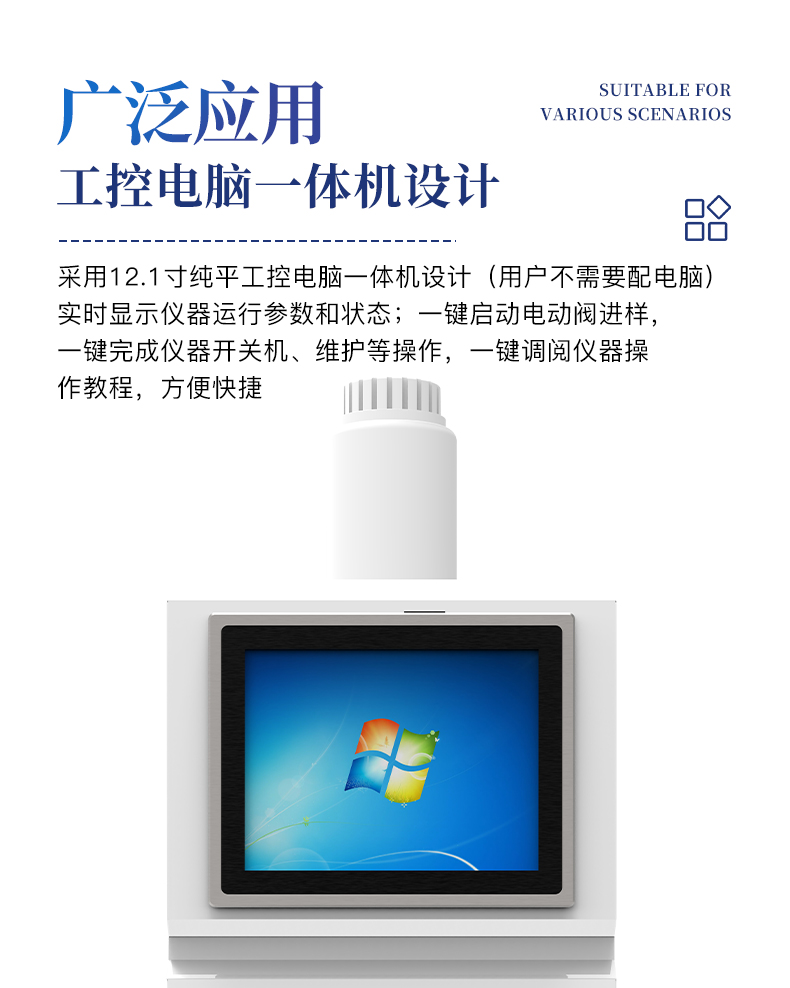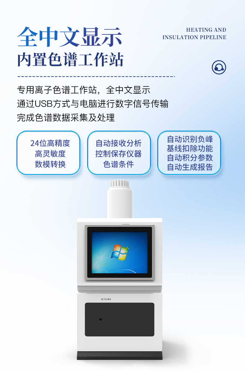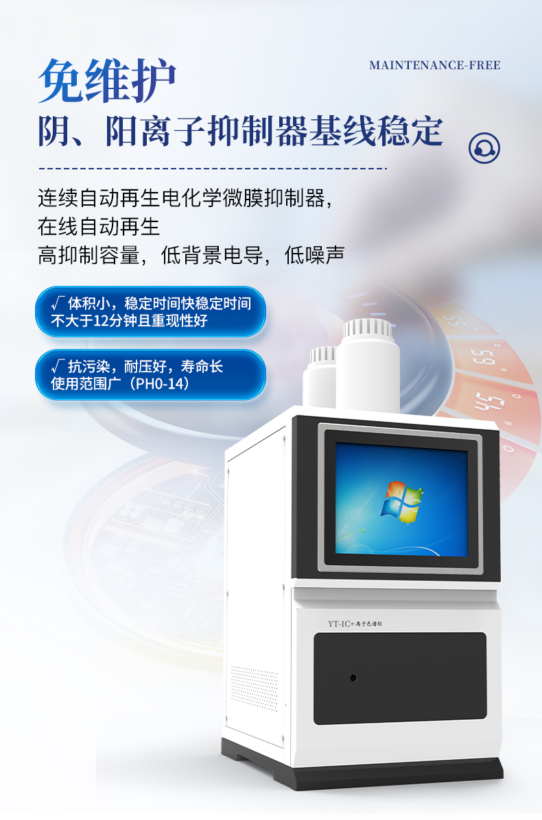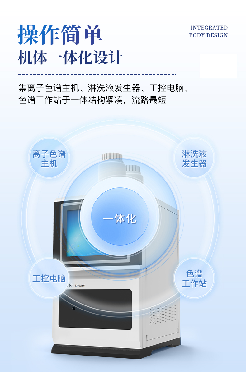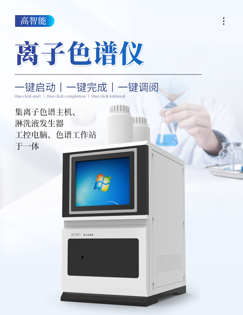 | 全新一代離子色譜儀,采用12.1吋純平工控電腦一體機設計(用戶不需要配電腦),實時顯示儀器運行參數(shù)和狀態(tài);一鍵啟動電動閥進樣,一鍵完成儀器開關機、維護等操作,一鍵調(diào)閱儀器操作教程,方便快捷。 | 離子色譜儀核心零部件自主研發(fā)、自主知識產(chǎn)權可控。采用一體化設計,集離子色譜主機、淋洗液發(fā)生器、工控電腦、色譜工作站于一體,結(jié)構緊湊,流路*短,對流路造成的峰型擴展有很好的改善。一體化恒溫箱:色譜柱、抑制器、電導池、放大電路都處于同一恒溫系統(tǒng),改善了電導檢測器的溫飄和基線噪聲。內(nèi)置多處漏液報警器和缺水報警器,全方位安全監(jiān)控。由PLC控制的各個部件統(tǒng)一到電腦顯示屏的集中軟件控制系統(tǒng),操作方便,鼠標所見即所控。 |