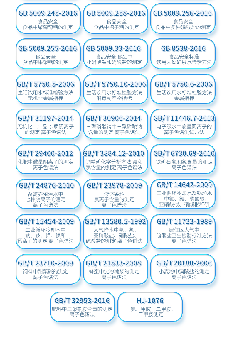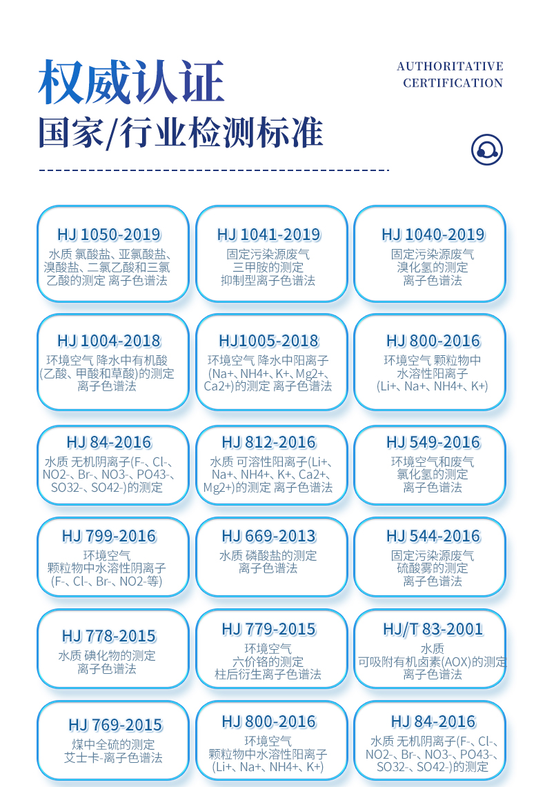 | HJ 1050-2019:水質(zhì) 氯酸鹽、亞氯酸鹽、溴酸鹽、二氯乙酸和三氯乙酸的測定 離子色譜法 | HJ 1041-2019 固定污染源廢氣 三甲胺的測定 抑制型離子色譜法 | HJ 1040-2019 固定污染源廢氣 溴化氫的測定 離子色譜法 | HJ 1004-2018 環(huán)境空氣 降水中有機酸(乙酸、甲酸和草酸)的測定 離子色譜法 | HJ1005-2018 環(huán)境空氣 降水中陽離子(Na+、NH4+、K+、Mg2+、Ca2+)的測定 離子色譜法 | HJ 800-2016 環(huán)境空氣 顆粒物中水溶性陽離子(Li+、Na+、NH4+、K+) | HJ 84-2016 水質(zhì) 無機陰離子(F-、Cl-、NO2-、Br-、NO3-、PO43-、SO32-、SO42-)的測定 | HJ 812-2016 水質(zhì) 可溶性陽離子(Li+、Na+、NH4+、K+、Ca2+、Mg2+)的測定 離子色譜法 | HJ 549-2016 環(huán)境空氣和廢氣 氯化氫的測定 離子色譜法 | HJ 799-2016 環(huán)境空氣 顆粒物中水溶性陰離子(F-、Cl-、Br-、NO2-等) | HJ 669-2013 水質(zhì) 磷酸鹽的測定 離子色譜法 | HJ 544-2016 固定污染源廢氣 硫酸霧的測定 離子色譜法 | HJ 778-2015 水質(zhì) 碘化物的測定 離子色譜法 | HJ 779-2015 環(huán)境空氣 六價鉻的測定 柱后衍生離子色譜法 | HJ/T 83-2001 水質(zhì) 可吸附有機鹵素(AOX)的測定 離子色譜法 | HJ 769-2015 煤中全硫的測定 艾士卡-離子色譜法 | HJ 800-2016 環(huán)境空氣 顆粒物中水溶性陽離子(Li+、Na+、NH4+、K+) | HJ 84-2016 水質(zhì) 無機陰離子(F-、Cl-、NO2-、Br-、NO3-、PO43-、SO32-、SO42-)的測定 | GB 5009.245-2016 食品安全 食品中聚葡萄糖的測定 | GB 5009.258-2016 食品安全 食品中棉子糖的測定 | GB 5009.256-2016 食品安全 食品中多種磷酸鹽的測定 | GB 5009.255-2016 食品安全 食品中果聚糖的測定 | GB 5009.33-2016 食品安全 食品中亞硝酸鹽和硝酸鹽的測定 | GB 8538-2016 食品安全標準 飲用天然礦泉水檢驗方法 | GB/T 5750.5-2006 生活飲用水標準檢驗方法 無機非金屬指標 | GB/T 5750.10-2006 生活飲用水標準檢驗方法 消毒副產(chǎn)物指標 | GB/T 5750.6-2006 生活飲用水標準檢驗方法 金屬指標 | GB/T 31197-2014 無機化工產(chǎn)品 雜質(zhì)陰離子的測定 離子色譜法 | GB/T 30906-2014 三聚磷酸鈉中三聚磷酸鈉含量的測定 離子色譜法 | GB/T 11446.7-2013 電子級水中痕量陰離子的離子色譜測試方法 | GB/T 29400-2012 化肥中微量陰離子的測定 離子色譜法 | GB/T 3884.12-2010 銅精礦化學分析方法 第12部分:氟和氯含量的測定 離子色譜法 | GB/T 6730.69-2010 鐵礦石 氟和氯含量的測定 離子色譜法 | GB/T 24876-2010 畜禽養(yǎng)殖污水中七種陰離子的測定 離子色譜法 | GB/T 23978-2009 液體染料 氯離子含量的測定 離子色譜法 | GB/T 14642-2009 工業(yè)循環(huán)冷卻水及鍋爐水中氟、氯、磷酸根、亞硝酸根、硝酸根和硫 | GB/T 15454-2009 工業(yè)循環(huán)冷卻水中鈉、銨、鉀、鎂和鈣離子的測定 離子色譜法 | GB/T 23710-2009 飼料中甜菜堿的測定 離子色譜法 | GB/T 21533-2008 蜂蜜中淀粉糖漿的測定 離子色譜法 | GB/T 20188-2006 小麥粉中溴酸鹽的測定 離子色譜法 | GB/T 13580.5-1992 大氣降水中氟、氯、亞硝酸鹽、硝酸鹽、硫酸鹽的測定 離子色譜法 | GB/T 32953-2016 肥料中三聚氰胺含量的測定 離子色譜法 | GB/T 11733-1989 居住區(qū)大氣中硫酸鹽衛(wèi)生檢驗標準方法 離子色譜法 | HJ-1076 氨、甲胺、二甲胺、三甲胺測定 |