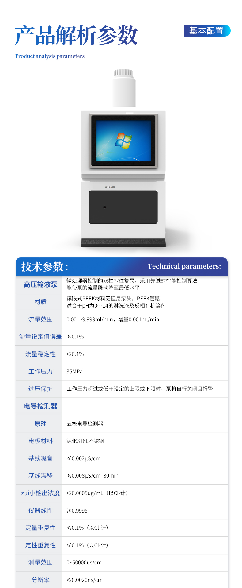 | 1 高壓輸液泵: 微處理器控制的雙柱塞往復泵,采用**的智能控制算法,能使泵的流量脈動降至**水平。 1.1,材質(zhì):鑲嵌式PEEK材料無阻尼泵頭,PEEK管路,適合于pH為0~14的淋洗液及反相有機溶劑。 1.2,流量范圍:0.001~9.999ml/min,增量0.001ml/min。 1.3,流量設定值誤差:≤0.1% 1.4,流量穩(wěn)定性:≤0.1% 1.5,工作壓力:35MPa 1.6,過壓保護:工作壓力超過或低于設定的上限或下限時,泵將自行關閉且報警。 | 2 電導檢測器: 2.1,原理:五極電導檢測器 2.2,電極材料:鈍化316L不銹鋼 2.3,基線噪音:≤0.002μS/cm 2.4,基線漂移:≤0.008μS/cm·30min 2.5,zui小檢出濃度:≤0.0005ug/mL(以Cl-計) 2.6,儀器線性:≥0.9995 2.7,定量重復性:≤0.1%(以Cl-計) 2.8,定性重復性:≤0.1%(以Cl-計) 2.9,測量范圍:0~50000us/cm 2.10,分辨率:≤0.0020ns/cm 2.11,檢測池體積:0.8uL 2.12,操作壓力:≤10Mpa。 2.13,電導檢測量程: 0-50000uS,10檔可調(diào)。 | 3、 陰、陽離子抑制器: 3.1連續(xù)自動再生電化學微膜抑制器,在線自動再生,高抑制容量,低背景電導,低噪聲,基線穩(wěn)定,免維護。 3.2抗污染,耐壓好,壽命長,使用范圍廣(PH0-14)。 3.3體積小,穩(wěn)定時間快,穩(wěn)定時間不大于12分鐘,且重現(xiàn)性好。 | 4 流路系統(tǒng): 4.1流路系統(tǒng)使用PEEK材料制造,通用性好,能使用強酸、強堿的淋洗液。 4.2百分之百的有機溶劑兼容,方便用戶對復雜樣品進行分析、沖洗和維護。 4.3 結(jié)構緊湊,流路*短,對流路造成的峰型擴展有很好的改善。 4.4 內(nèi)置多處漏液報警器和缺水報警器,全方位安全監(jiān)控。 | 5 內(nèi)置色譜工作站: 5.1 24位高精度高靈敏度數(shù)模轉(zhuǎn)換。 5.2專用離子色譜工作站,全中文顯示,通過USB方式與電腦進行數(shù)字信號傳輸,完成色譜數(shù)據(jù)采集及處理。 5.3自動接收分析和控制保存儀器色譜條件。 5.4自動識別負峰、基線扣除功能。自動積分參數(shù)、自動生成報告。 | 6 色譜柱、抑制器、電導池、放大電路一體恒溫系統(tǒng): 將電導池、流路系統(tǒng)、分離柱、抑制器、放大電路恒溫在同一個控溫基體上置于柱箱內(nèi),恒溫精度5~65℃±0.01℃。并且儀器柱箱采用絕熱結(jié)構,可保持檢測系統(tǒng)、流路及柱子、抑制器、電導池、放大電路的溫度恒定,獲得高質(zhì)量的分離效果和檢測精度,改善了電導檢測器的溫飄和基線噪聲。 | 7內(nèi)置淋洗液發(fā)生器,僅用高純水,無需人工配制任何化學試劑,在線產(chǎn)生等度或梯度高純淋洗液,減少基線漂移,提高穩(wěn)定性,簡化工作流程。 | 8 在線自動脫氣系統(tǒng): 1,脫氣效率:在25℃入口流動相的含氧量為8PPM時,出口流動相的含氧量為2PPM (流速:1.5ml\min) 2,真空壓力:-0.018MPa 3,流量:5mL/min | 9 分離能力:(分別配置不同的陰、陽離子分離柱,可以分離的離子種類:) 配置國產(chǎn)陰離子分離柱:一次進樣分析:氟化物、氯化物、亞硝酸鹽、磷酸鹽、溴化物、硝酸鹽、硫酸鹽 配置進口陰離子分離柱:一次進樣分析:氟化物、溴酸鹽、氯化物、亞硝酸鹽、磷酸鹽、溴化物、硝酸鹽、硫酸鹽、亞氯酸鹽、高氯酸鹽、二氯乙酸、三氯乙酸等 配置進口陽離子分離柱:一次進樣分析::Li+、Na+、NH4+、K+、Ca2+、Mg2+、Sr2+、Ba2+等 | 10 重量:30kg左右 尺寸mm:長500,寬400,高600 |