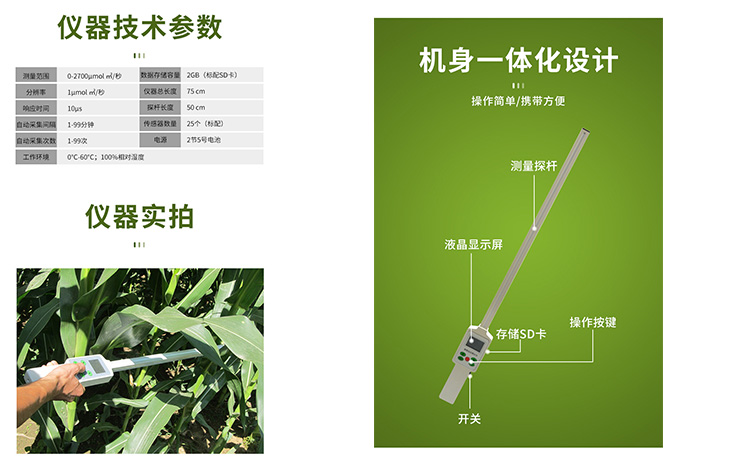 廣泛應用于農業生產和農業科研,為進行冠層光能資源調查,研究作物的生長發育、產量品質與光能利用間的關系, 本儀器用于400-帶700n m寬內的光合有效輻射(PAR)自動或手動測量、記錄,測量值的單位是平方米·秒上的微摩爾(μmols-1m-2)。